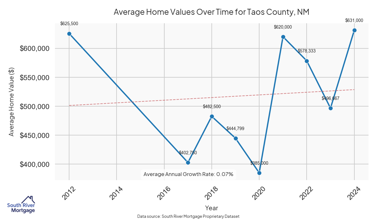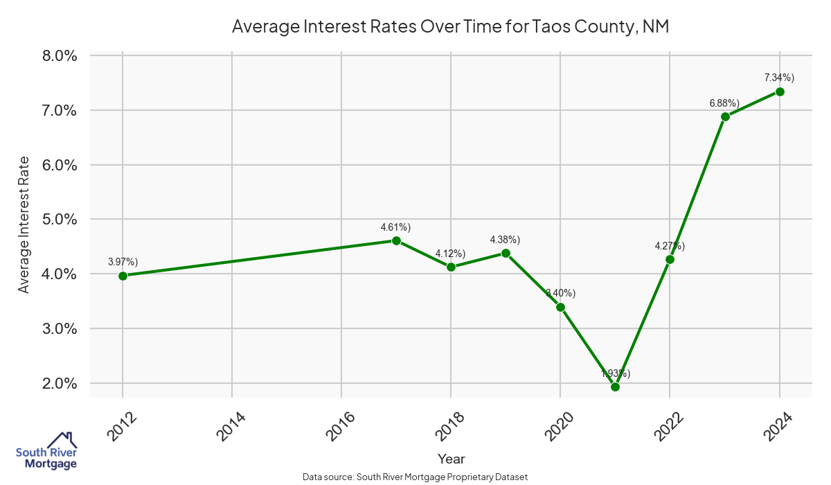There are approximately 19 active reverse mortgage loans in Taos County. The average interest rate in Taos County is 6.41% for reverse mortgages. The average maximum claim amount (the lesser of the appraisal or lending limit), among reverse mortgage borrowers, in Taos County was $505,000.00 in 2024.