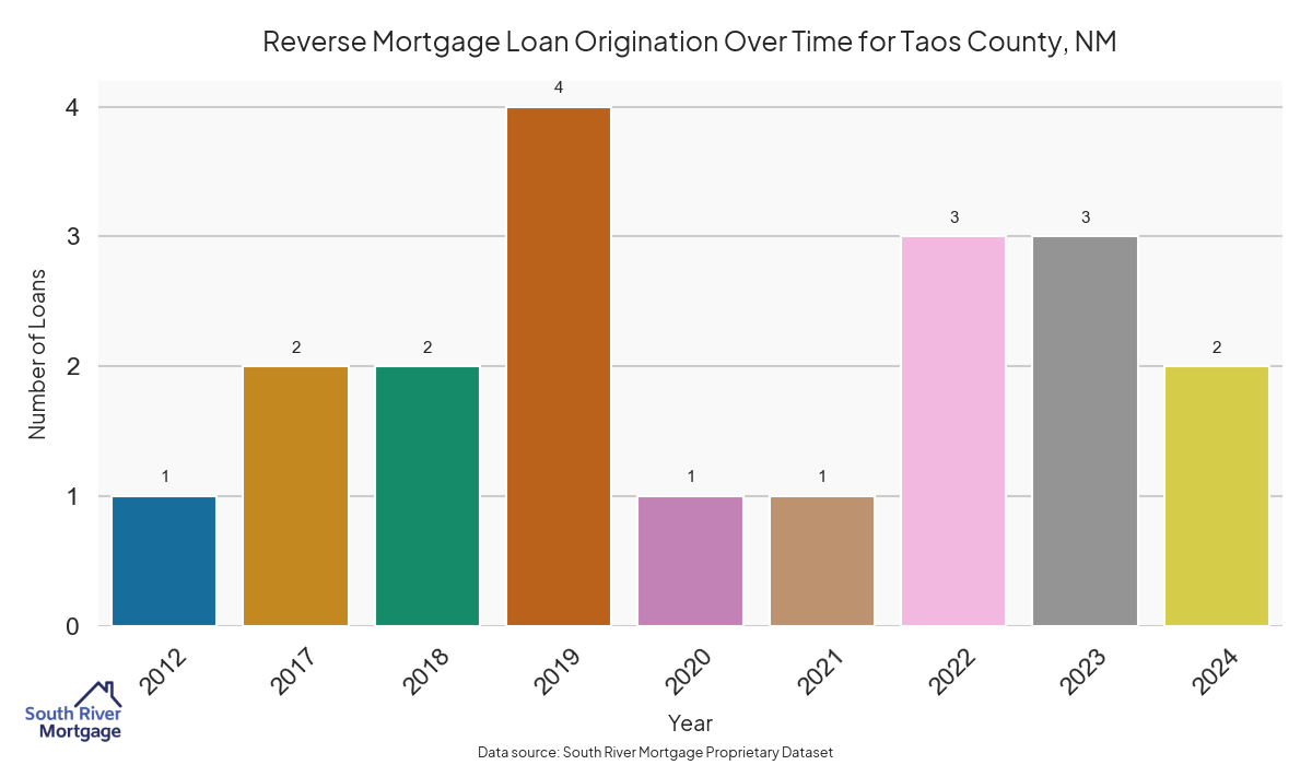 In 2024, there were 19 active reverse mortgage loans in Taos County, New Mexico. The average home value in Taos County is $576,931.32.