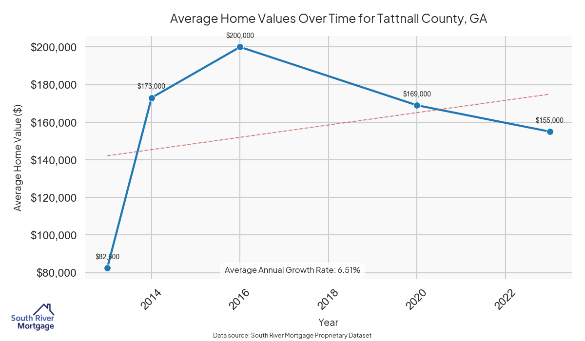 In 2024, there were 6 active reverse mortgage loans in Tattnall County, Georgia. The average home value in Tattnall County is $132,727.17.