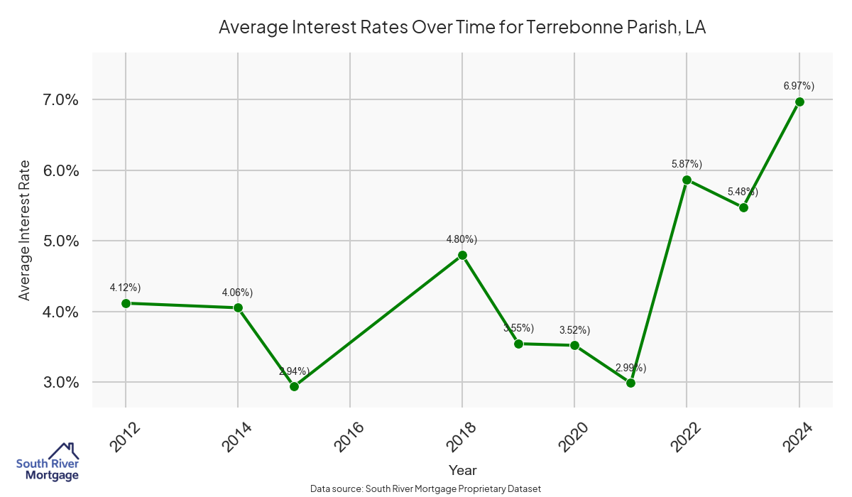 There are approximately 94 active reverse mortgage loans in Terrebonne Parish. The average interest rate in Terrebonne Parish is 7.87% for reverse mortgages. The average maximum claim amount (the lesser of the appraisal or lending limit), among reverse mortgage borrowers, in Terrebonne Parish was $335,000.00 in 2024.