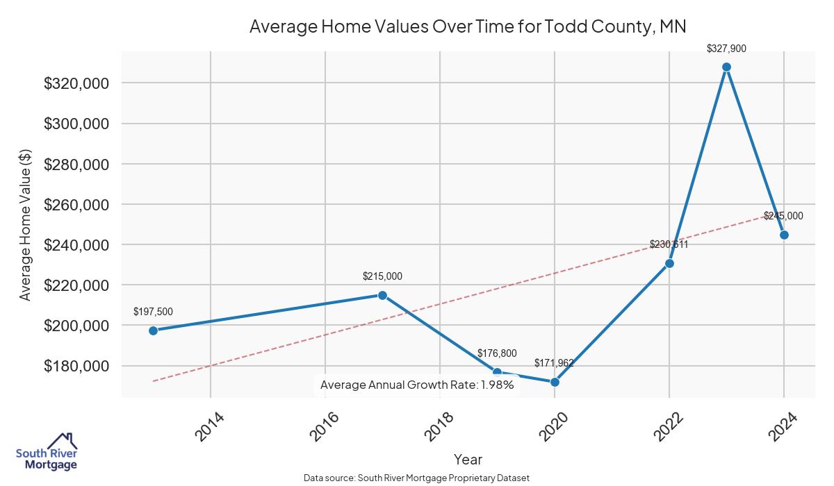 In 2024, there were 15 active reverse mortgage loans in Todd County, Minnesota. The average home value in Todd County is $314,838.47.