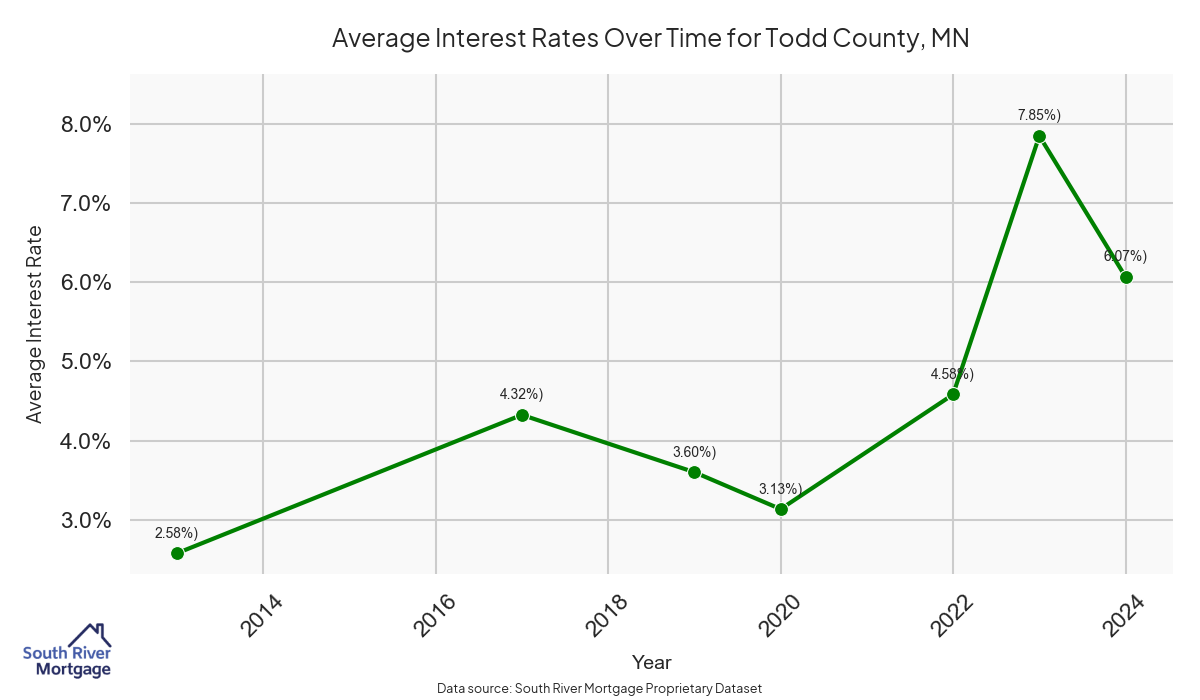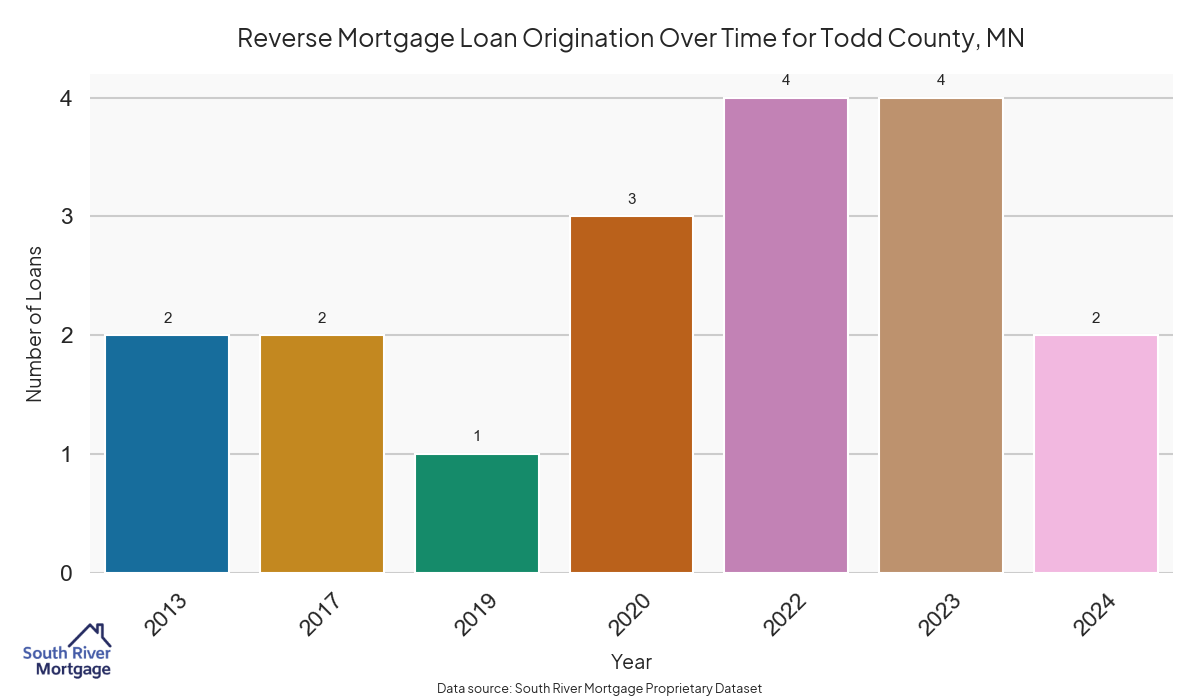 There are approximately 15 active reverse mortgage loans in Todd County. The average interest rate in Todd County is 7.78% for reverse mortgages. The average maximum claim amount (the lesser of the appraisal or lending limit), among reverse mortgage borrowers, in Todd County was $330,000.00 in 2024.