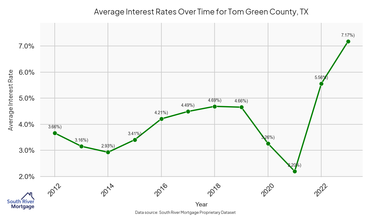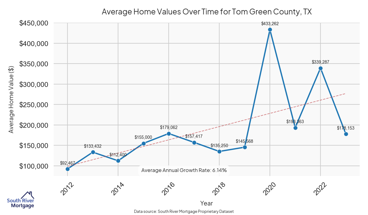 There are approximately 140 active reverse mortgage loans in Tom Green County. The average interest rate in Tom Green County is 7.49% for reverse mortgages. The average maximum claim amount (the lesser of the appraisal or lending limit), among reverse mortgage borrowers, in Tom Green County was $180,000.00 in 2024.