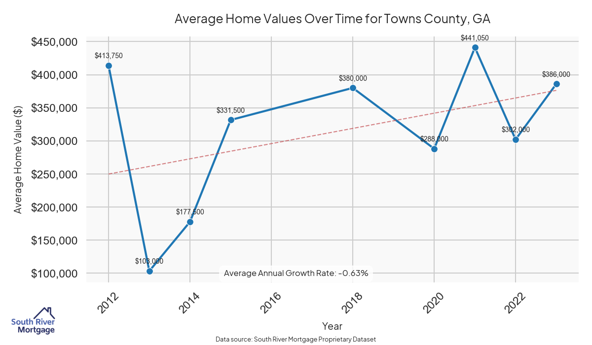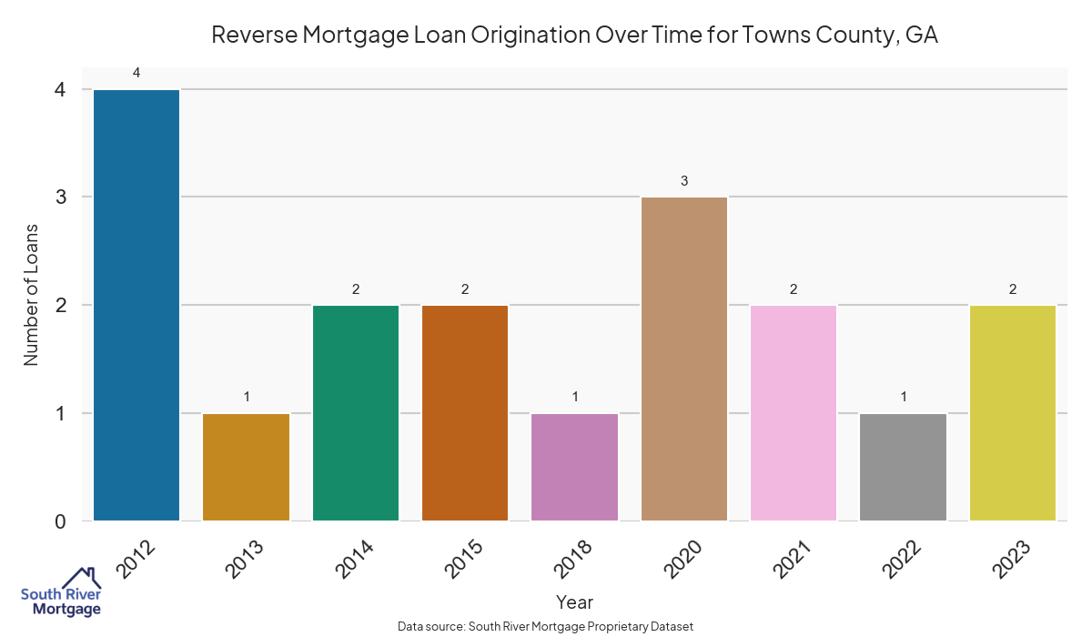 In 2024, there were 18 active reverse mortgage loans in Towns County, Georgia. The average home value in Towns County is $571,093.56.