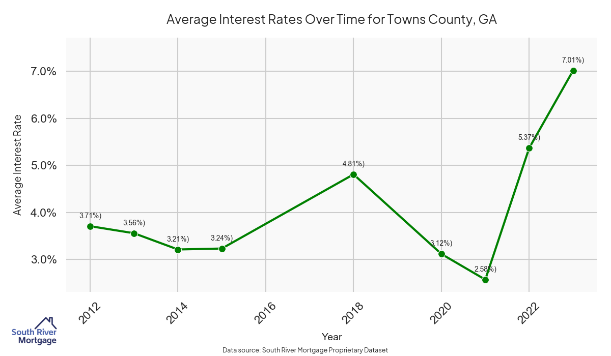 There are approximately 18 active reverse mortgage loans in Towns County. The average interest rate in Towns County is 6.69% for reverse mortgages. The average maximum claim amount (the lesser of the appraisal or lending limit), among reverse mortgage borrowers, in Towns County was $351,666.67 in 2024.