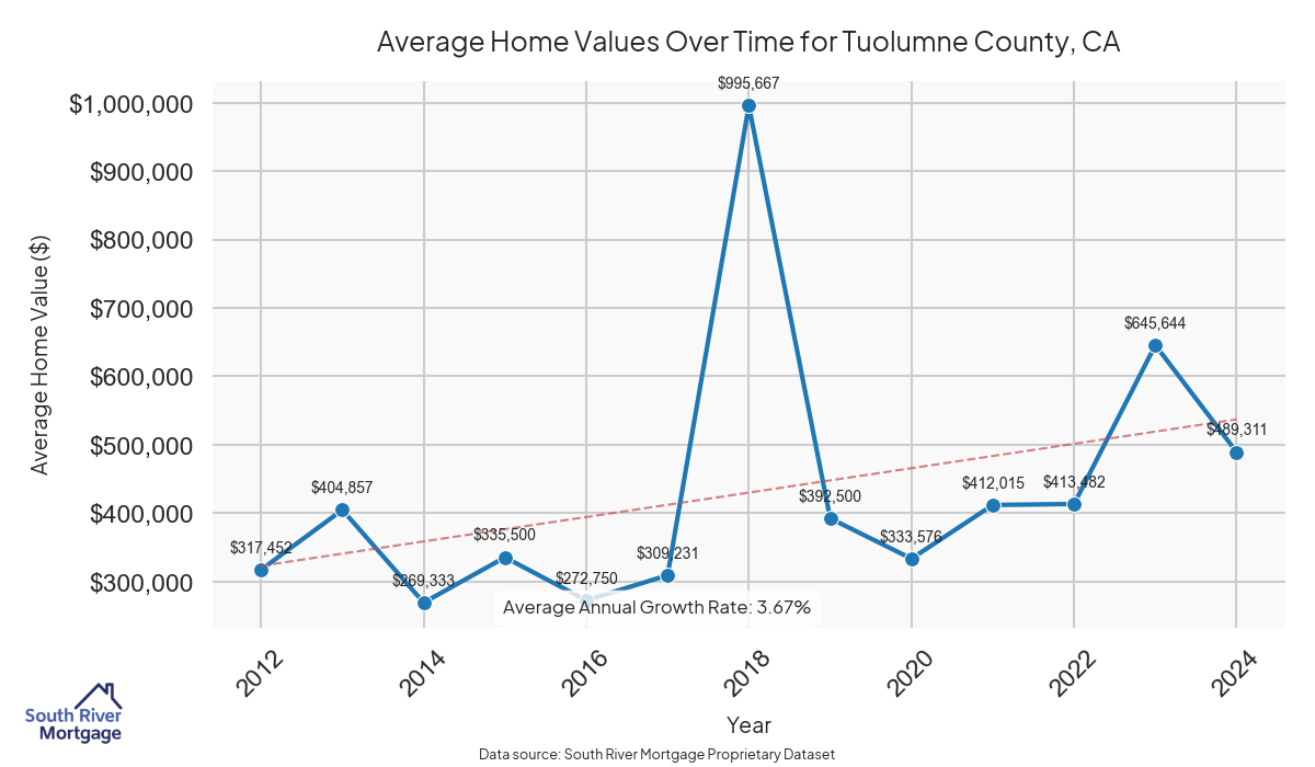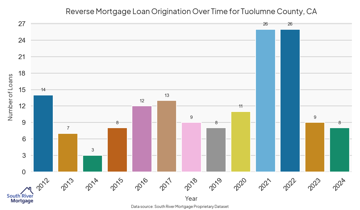 In 2024, there were 152 active reverse mortgage loans in Tuolumne County, California. The average home value in Tuolumne County is $448,940.84.