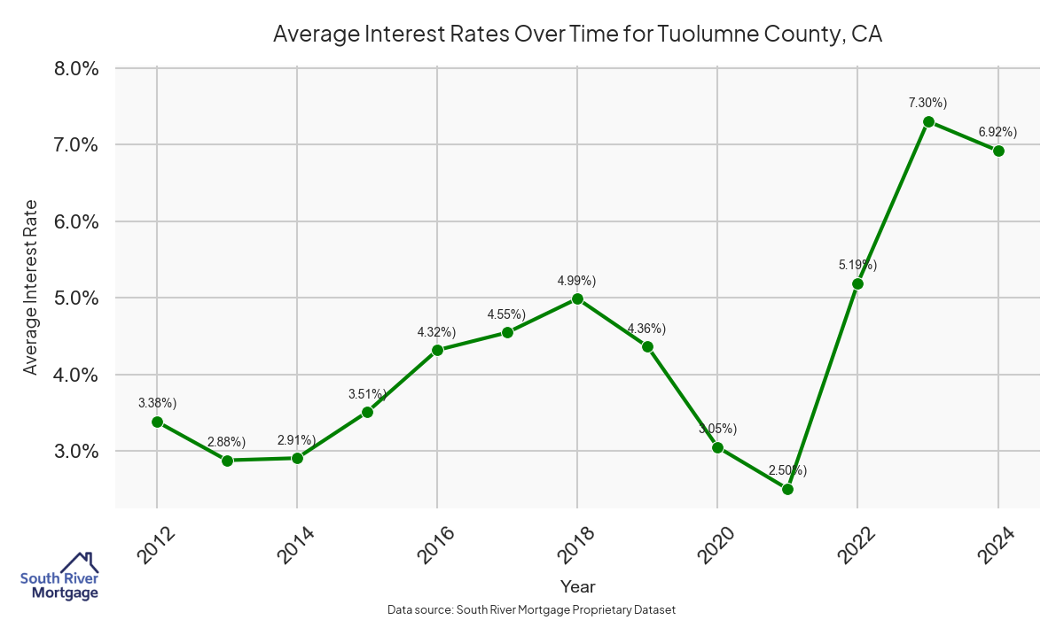 There are approximately 152 active reverse mortgage loans in Tuolumne County. The average interest rate in Tuolumne County is 7.61% for reverse mortgages. The average maximum claim amount (the lesser of the appraisal or lending limit), among reverse mortgage borrowers, in Tuolumne County was $504,000.00 in 2024.