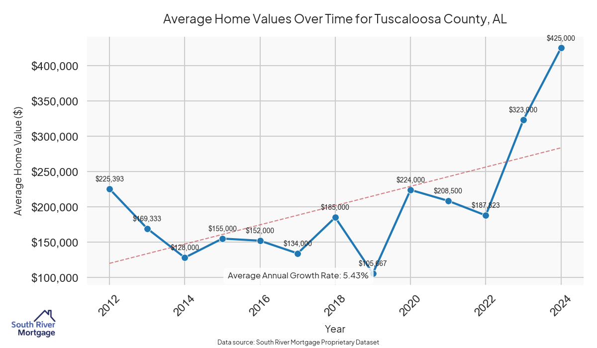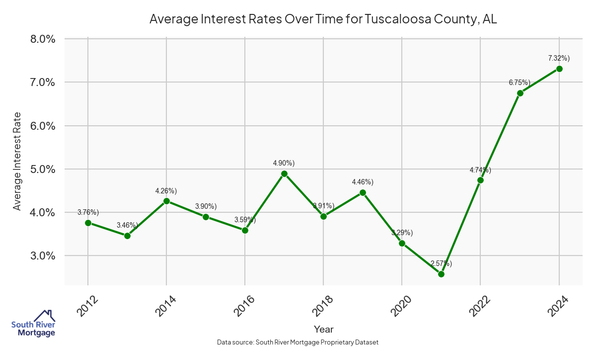 There are approximately 50 active reverse mortgage loans in Tuscaloosa County. The average interest rate in Tuscaloosa County is 6.98% for reverse mortgages. The average maximum claim amount (the lesser of the appraisal or lending limit), among reverse mortgage borrowers, in Tuscaloosa County was $305,000.00 in 2024.