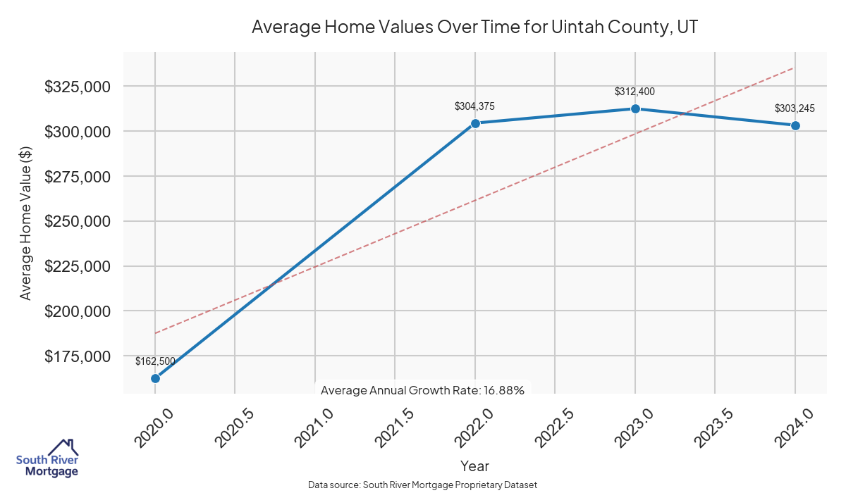 There are approximately 18 active reverse mortgage loans in Uintah County. The average interest rate in Uintah County is 6.89% for reverse mortgages. The average maximum claim amount (the lesser of the appraisal or lending limit), among reverse mortgage borrowers, in Uintah County was $295,000.00 in 2024.