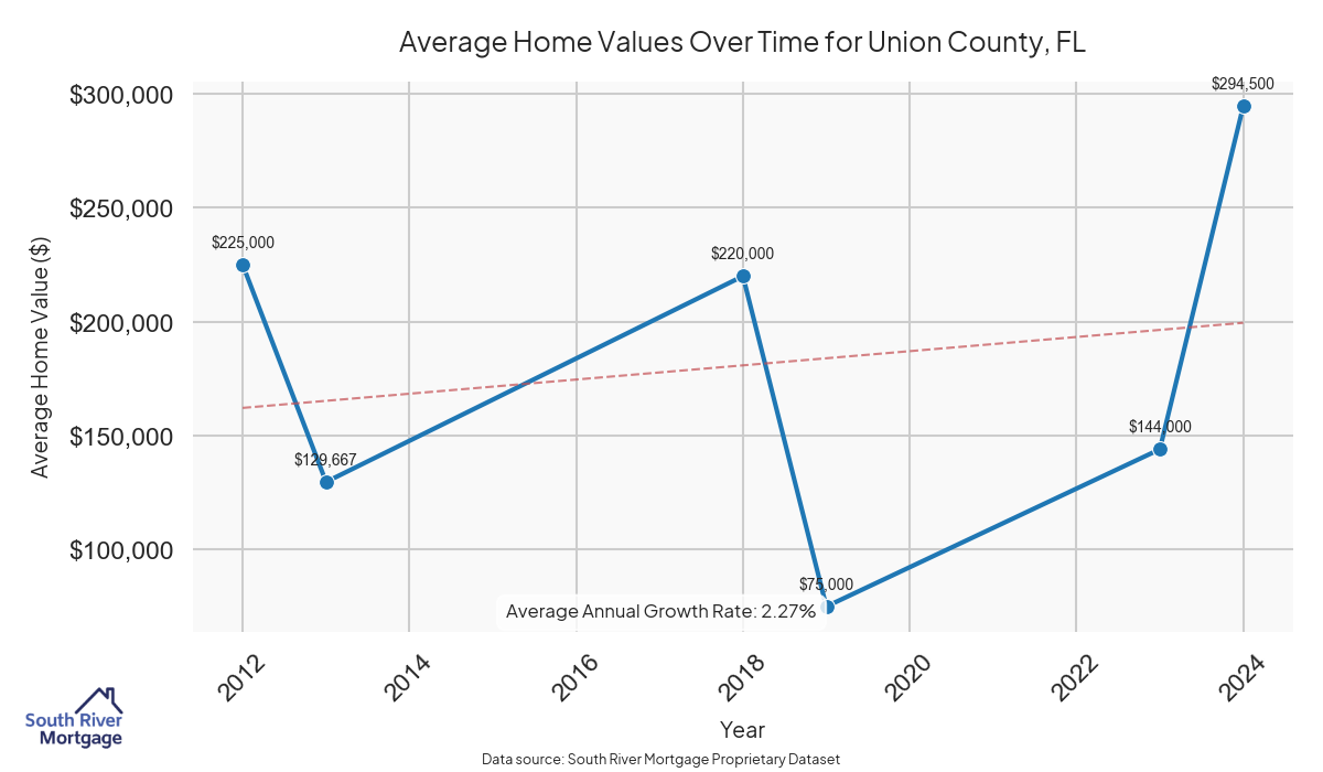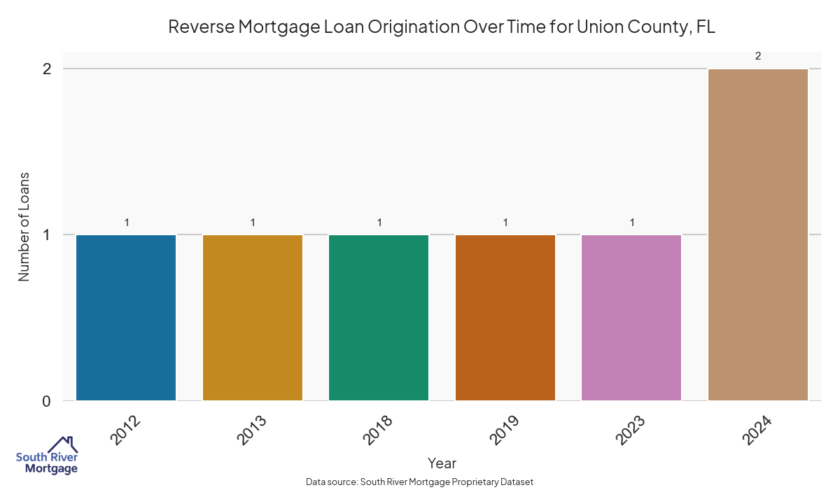 In 2024, there were 7 active reverse mortgage loans in Union County, Florida. The average home value in Union County is $226,401.86.