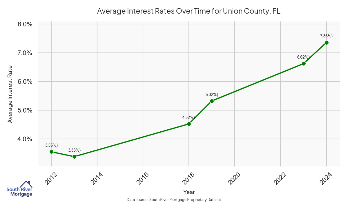 There are approximately 7 active reverse mortgage loans in Union County. The average interest rate in Union County is 6.96% for reverse mortgages. The average maximum claim amount (the lesser of the appraisal or lending limit), among reverse mortgage borrowers, in Union County was $210,000.00 in 2024.