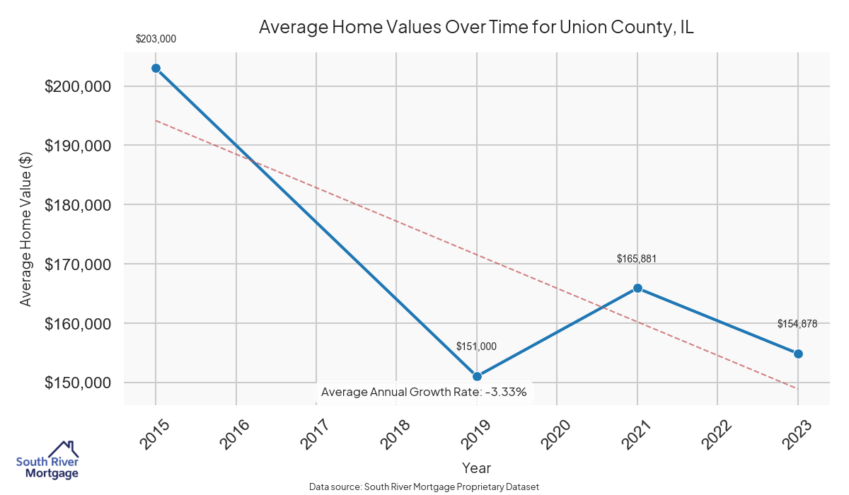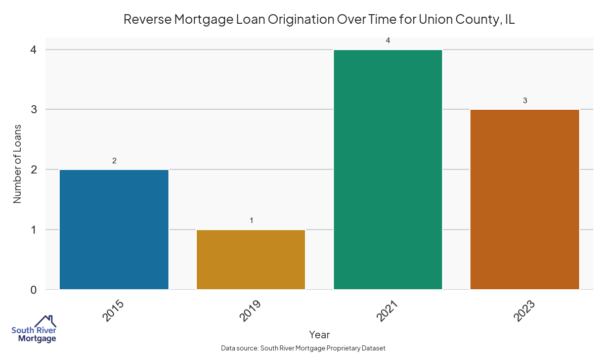 In 2024, there were 2 active reverse mortgage loans in Union County, Illinois. The average home value in Union County is $399,187.00.