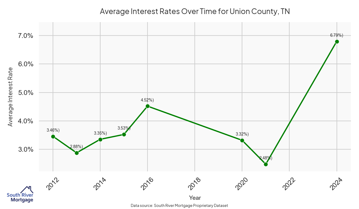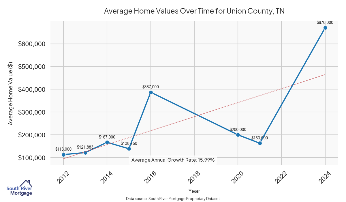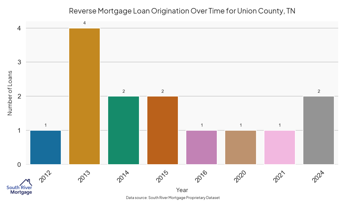 In 2024, there were 13 active reverse mortgage loans in Union County, Tennessee. The average home value in Union County is $318,374.85.