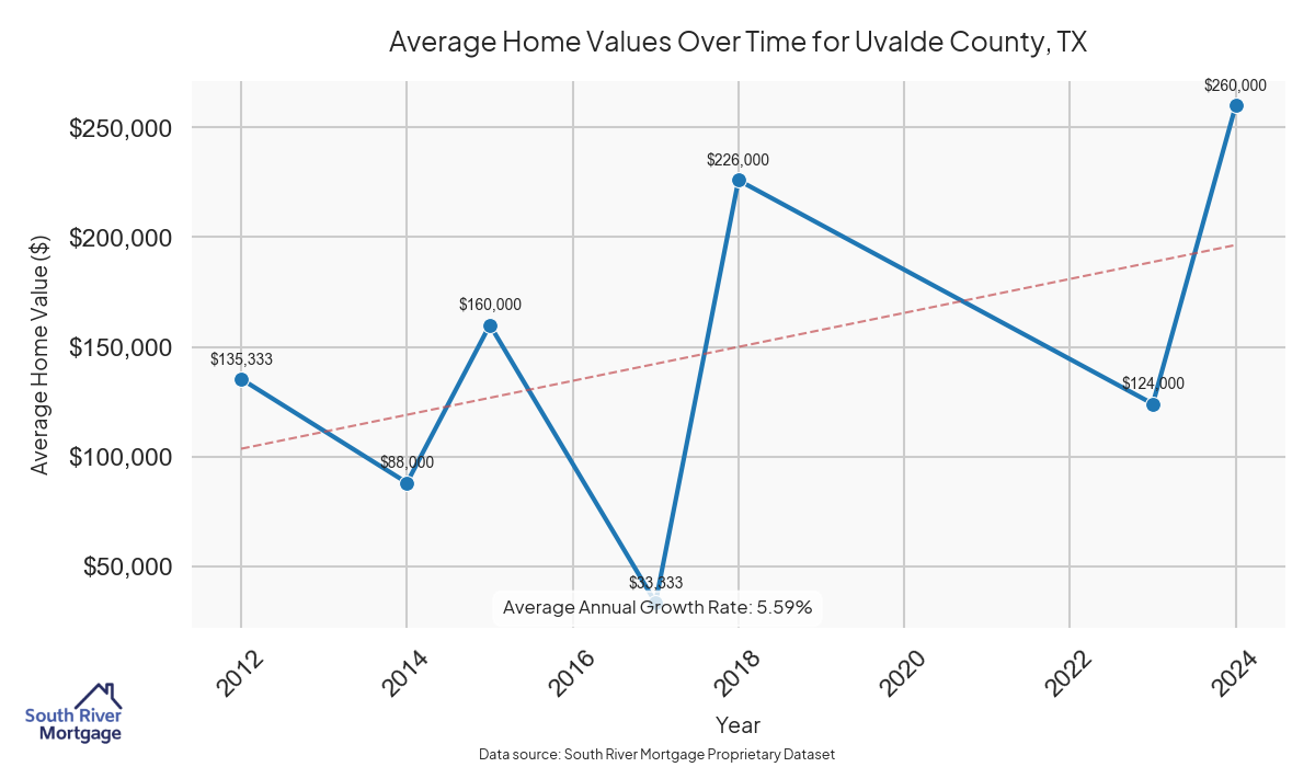 There are approximately 12 active reverse mortgage loans in Uvalde County. The average interest rate in Uvalde County is 7.91% for reverse mortgages. The average maximum claim amount (the lesser of the appraisal or lending limit), among reverse mortgage borrowers, in Uvalde County was $125,000.00 in 2024.
