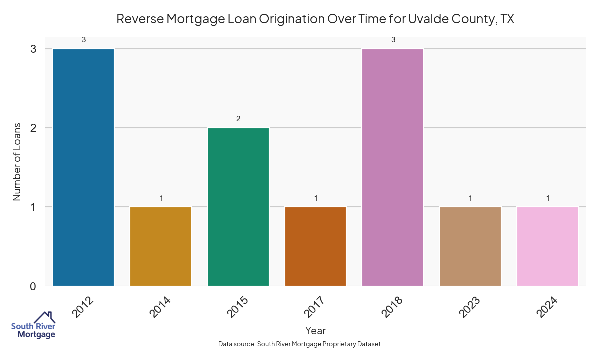 In 2024, there were 12 active reverse mortgage loans in Uvalde County, Texas. The average home value in Uvalde County is $250,035.08.