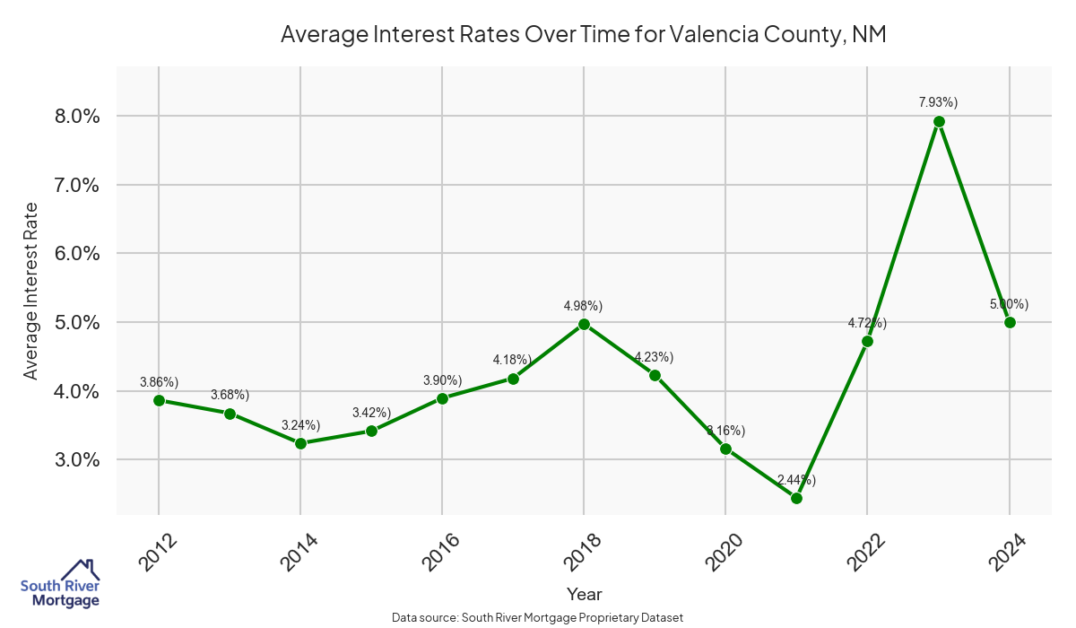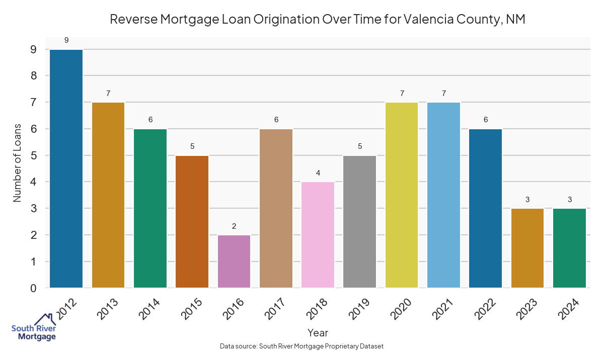 There are approximately 68 active reverse mortgage loans in Valencia County. The average interest rate in Valencia County is 7.71% for reverse mortgages. The average maximum claim amount (the lesser of the appraisal or lending limit), among reverse mortgage borrowers, in Valencia County was $387,500.00 in 2024.