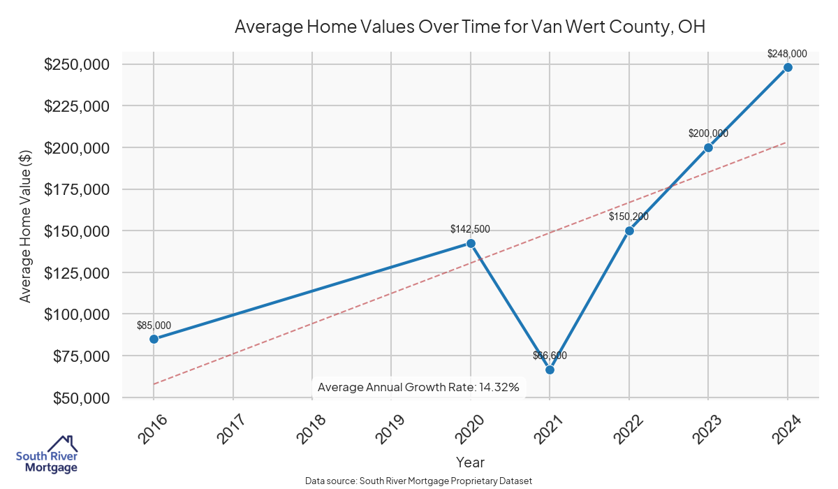 In 2024, there were 13 active reverse mortgage loans in Van Wert County, Ohio. The average home value in Van Wert County is $236,213.85.