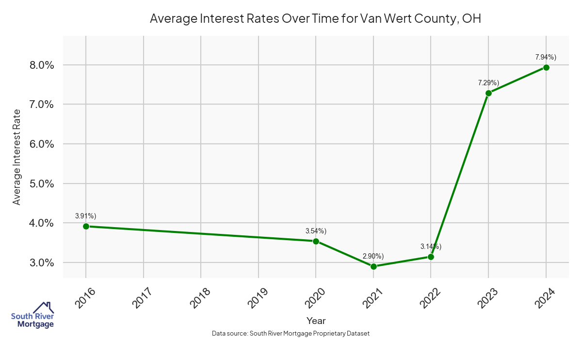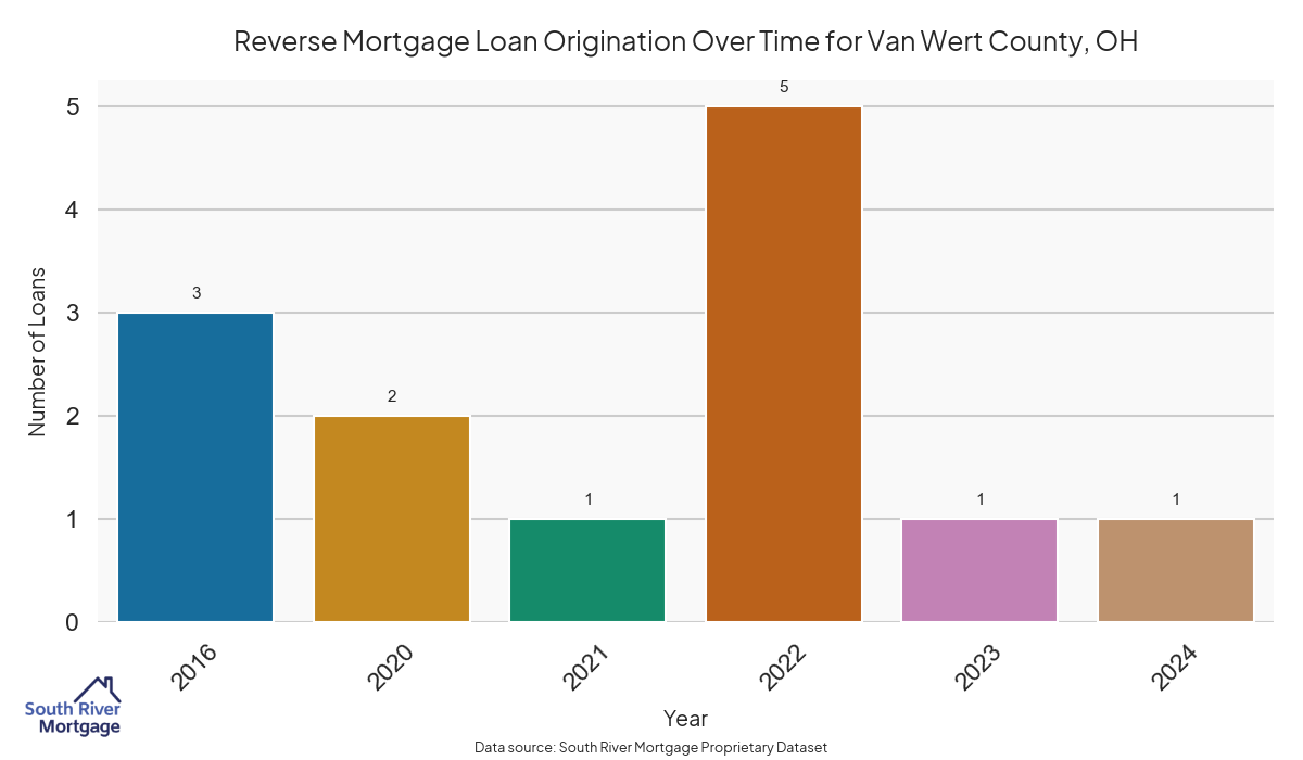 There are approximately 13 active reverse mortgage loans in Van Wert County. The average interest rate in Van Wert County is 7.08% for reverse mortgages. The average maximum claim amount (the lesser of the appraisal or lending limit), among reverse mortgage borrowers, in Van Wert County was $160,000.00 in 2024.