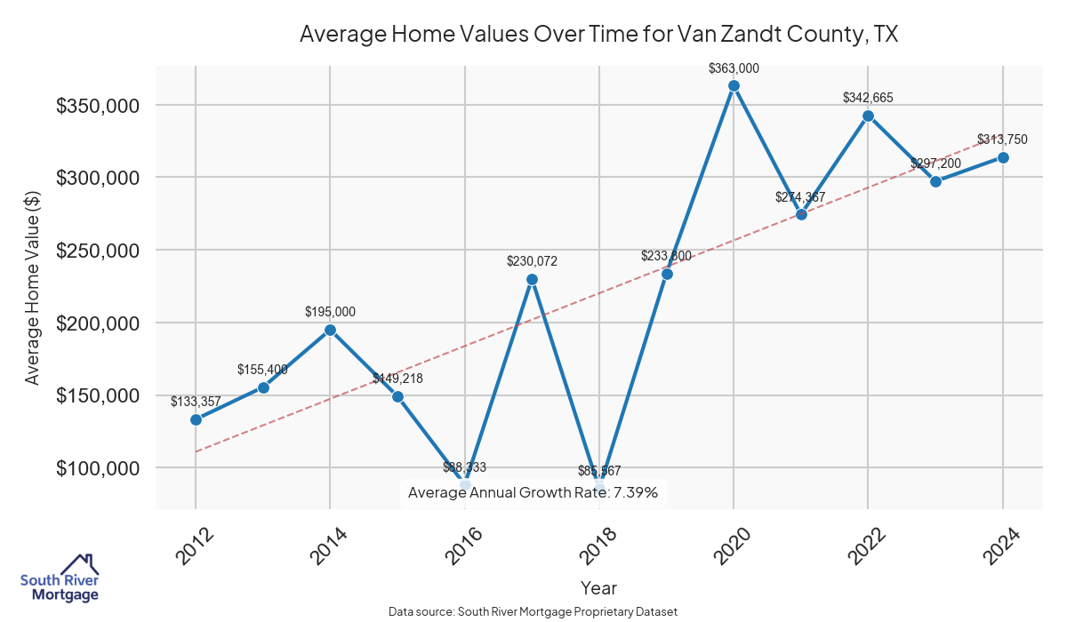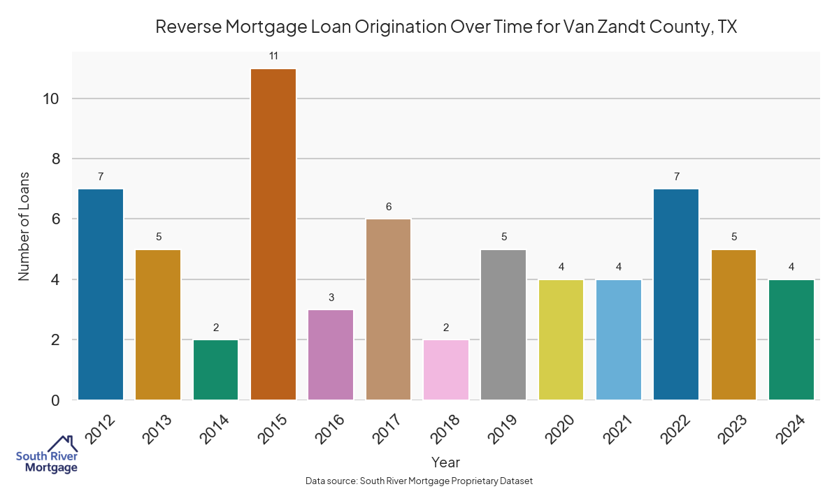 There are approximately 64 active reverse mortgage loans in Van Zandt County. The average interest rate in Van Zandt County is 7.71% for reverse mortgages. The average maximum claim amount (the lesser of the appraisal or lending limit), among reverse mortgage borrowers, in Van Zandt County was $338,750.00 in 2024.