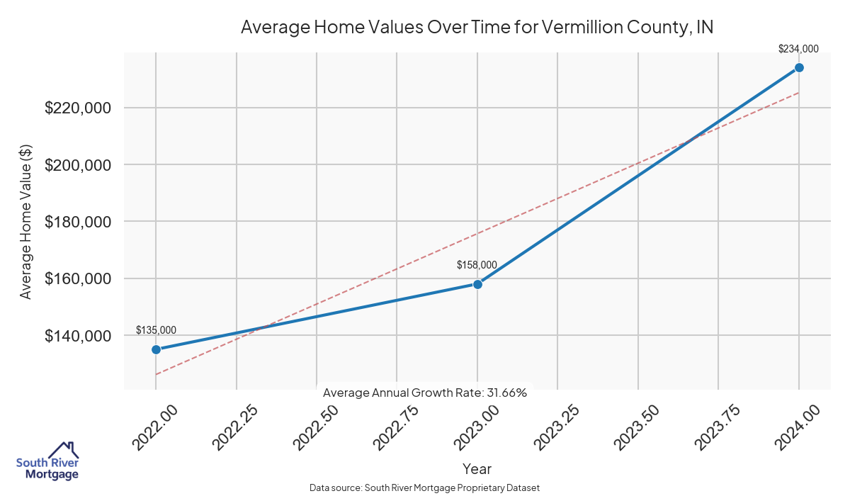 In 2024, there were 4 active reverse mortgage loans in Vermillion County, Indiana. The average home value in Vermillion County is $57,059.75.