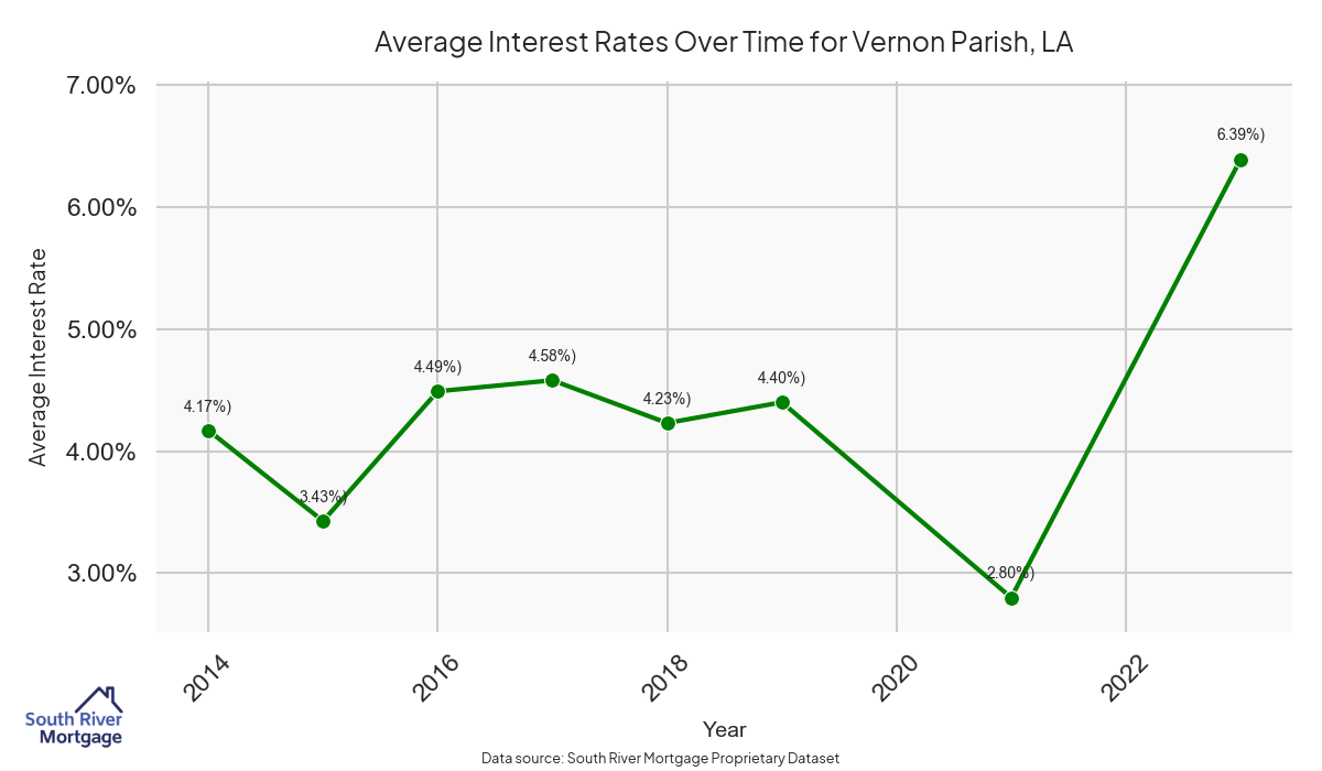 There are approximately 16 active reverse mortgage loans in Vernon Parish. The average interest rate in Vernon Parish is 7.58% for reverse mortgages. The average maximum claim amount (the lesser of the appraisal or lending limit), among reverse mortgage borrowers, in Vernon Parish was $165,000.00 in 2024.