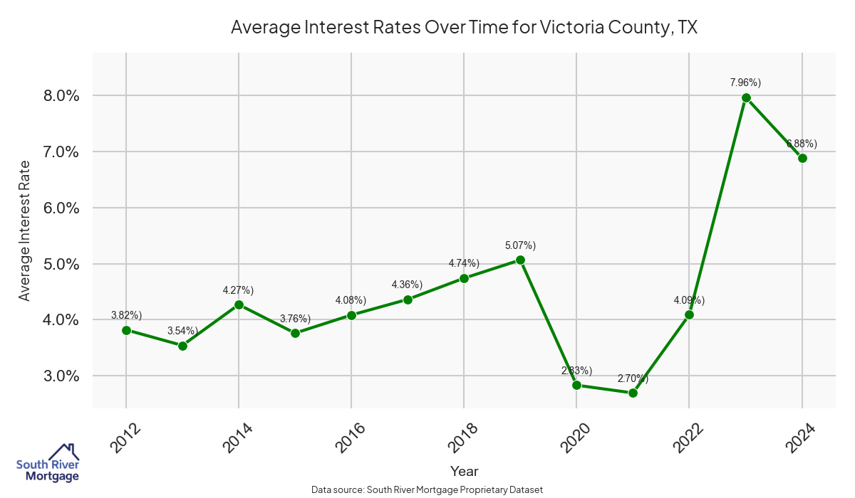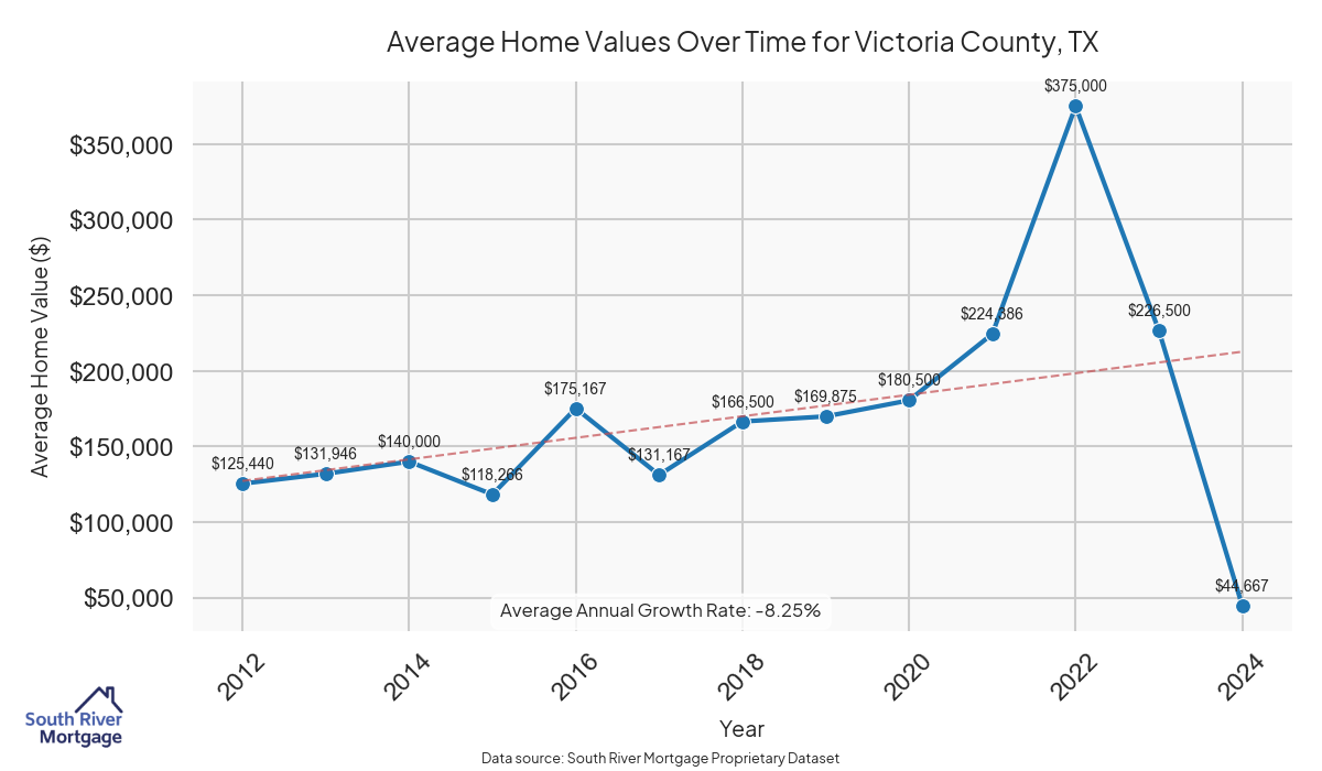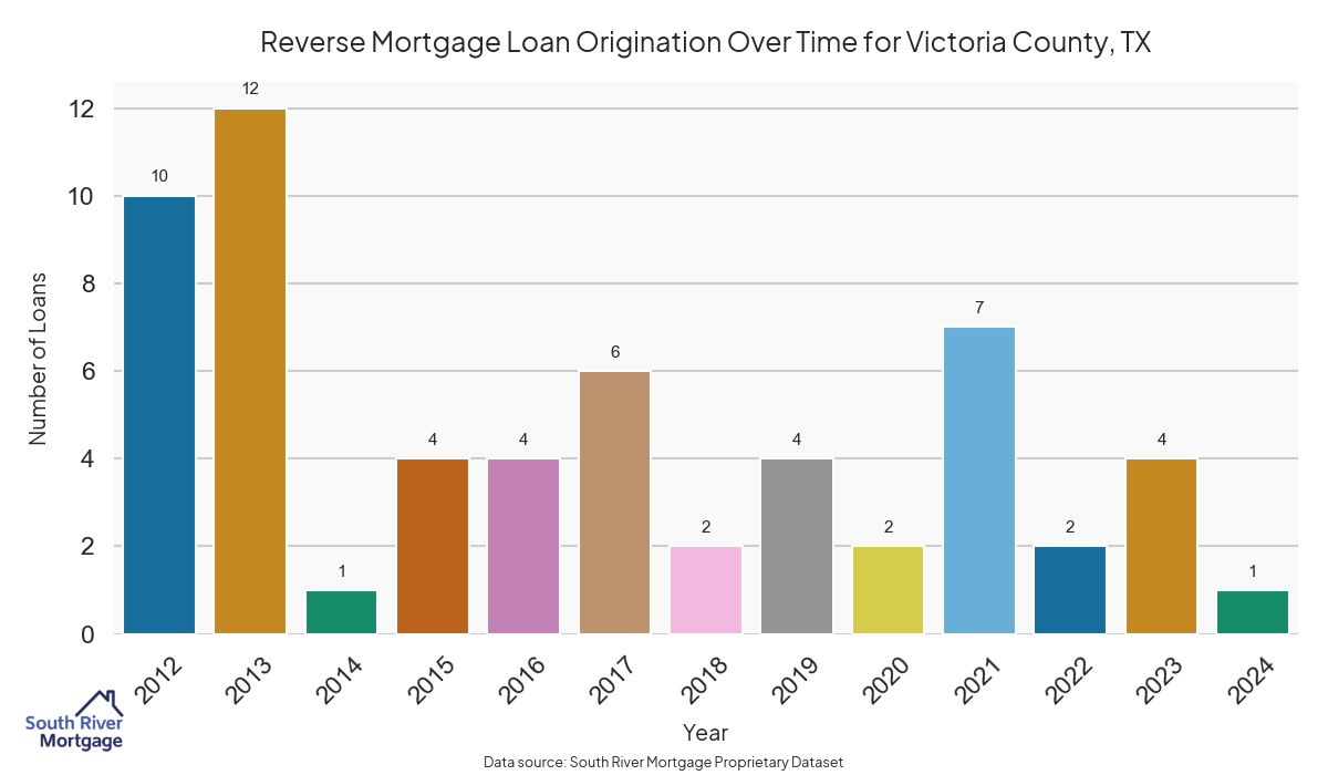 There are approximately 57 active reverse mortgage loans in Victoria County. The average interest rate in Victoria County is 7.96% for reverse mortgages. The average maximum claim amount (the lesser of the appraisal or lending limit), among reverse mortgage borrowers, in Victoria County was $230,000.00 in 2024.