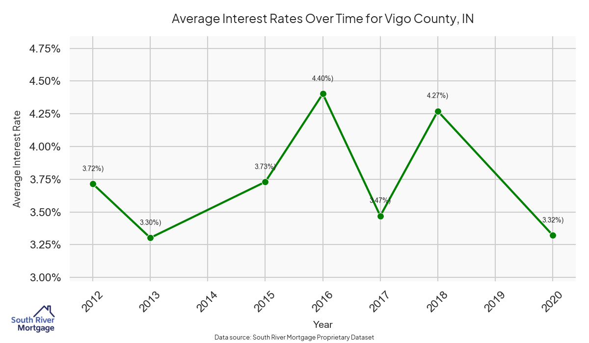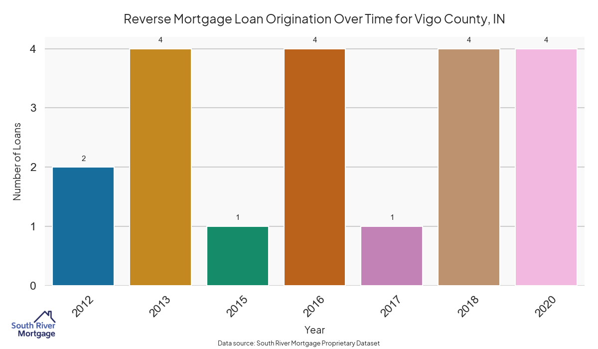 There are approximately 20 active reverse mortgage loans in Vigo County. The average interest rate in Vigo County is 7.38% for reverse mortgages. The average maximum claim amount (the lesser of the appraisal or lending limit), among reverse mortgage borrowers, in Vigo County was $235,000.00 in 2024.