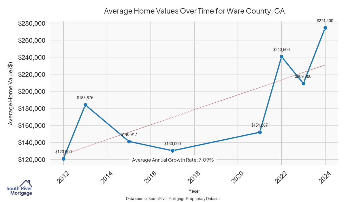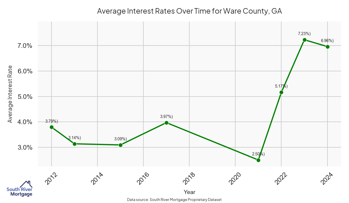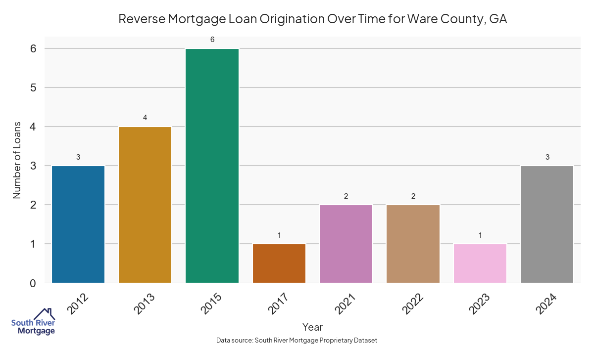 There are approximately 22 active reverse mortgage loans in Ware County. The average interest rate in Ware County is 6.91% for reverse mortgages. The average maximum claim amount (the lesser of the appraisal or lending limit), among reverse mortgage borrowers, in Ware County was $205,000.00 in 2024.