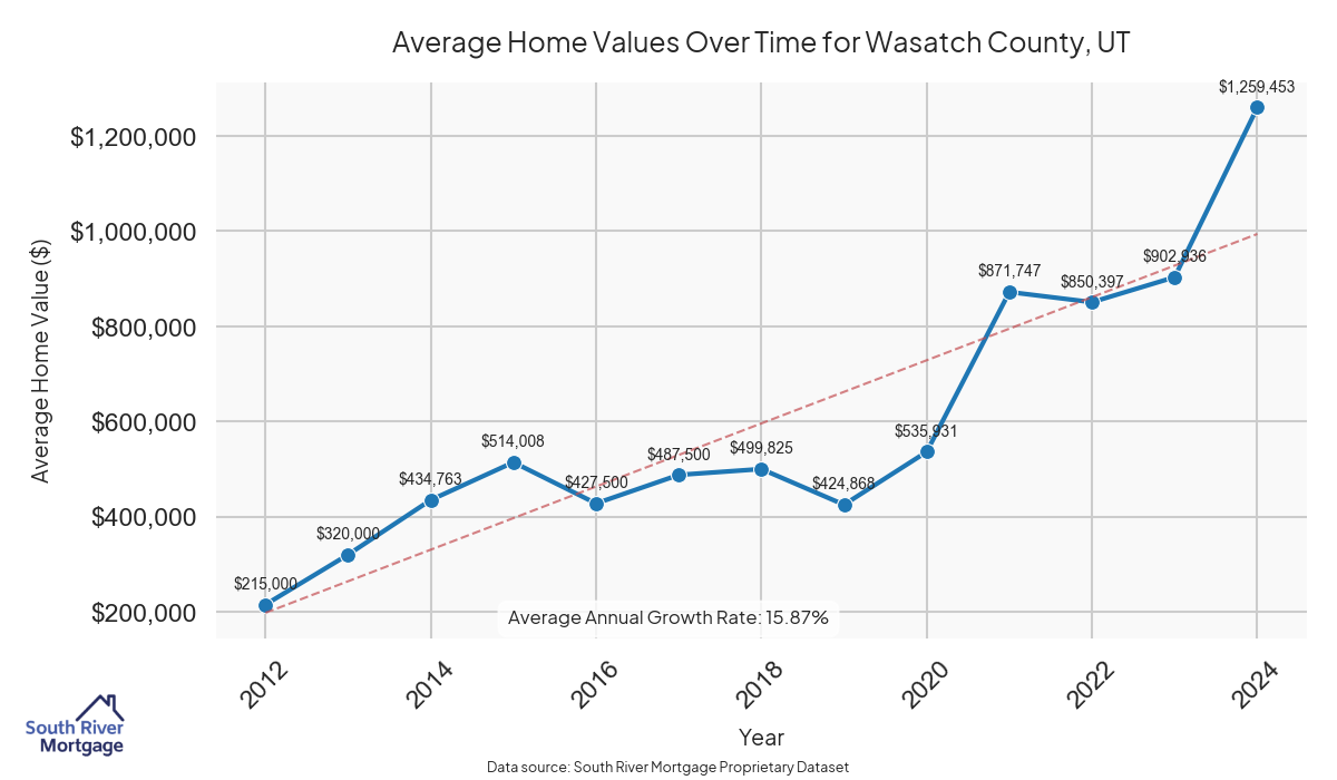 In 2024, there were 91 active reverse mortgage loans in Wasatch County, Utah. The average home value in Wasatch County is $615,200.96.