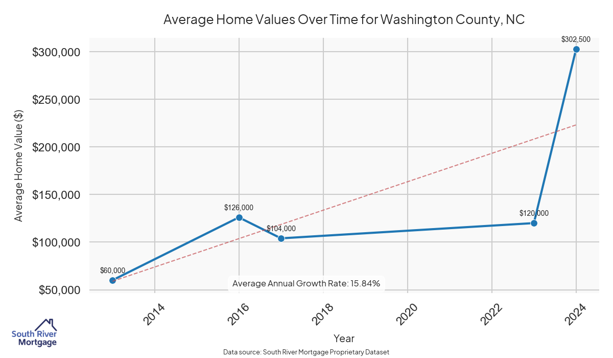 In 2024, there were 6 active reverse mortgage loans in Washington County, North Carolina. The average home value in Washington County is $262,301.00.