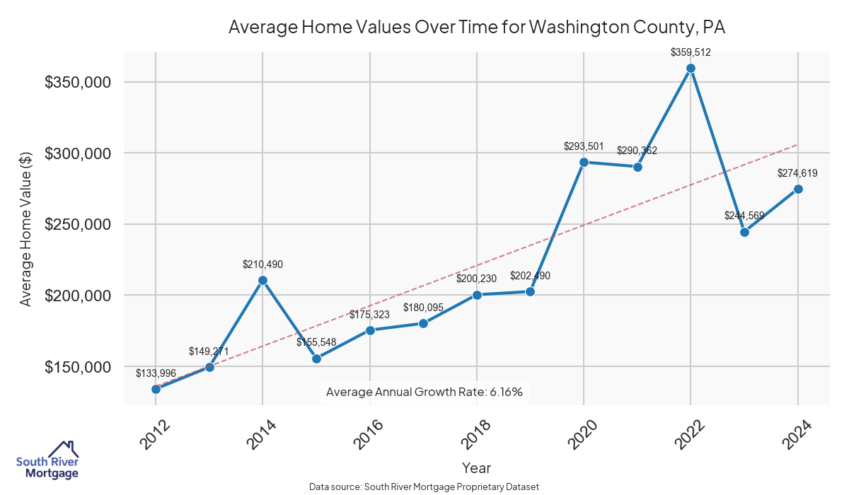 In 2024, there were 161 active reverse mortgage loans in Washington County, Pennsylvania. The average home value in Washington County is $305,995.82.
