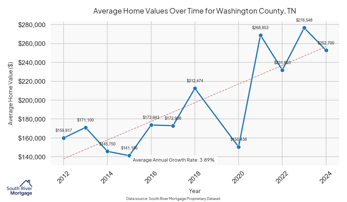 In 2024, there were 126 active reverse mortgage loans in Washington County, Tennessee. The average home value in Washington County is $329,521.28.