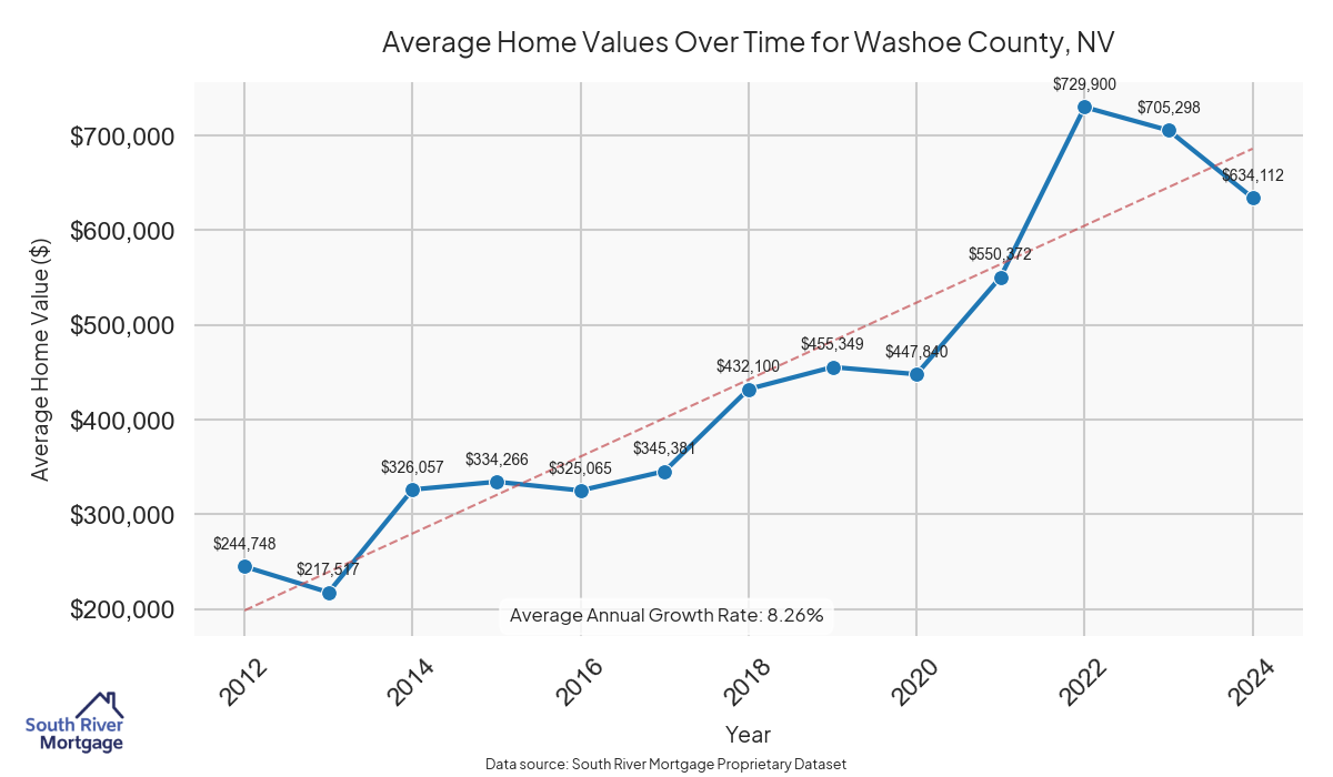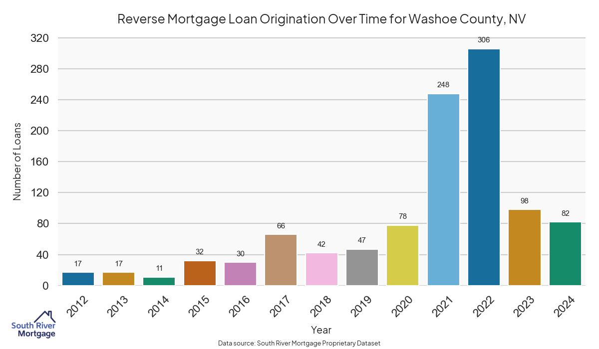 In 2024, there were 1026 active reverse mortgage loans in Washoe County, Nevada. The average home value in Washoe County is $690,573.56.
