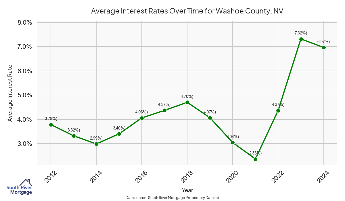 There are approximately 1026 active reverse mortgage loans in Washoe County. The average interest rate in Washoe County is 7.69% for reverse mortgages. The average maximum claim amount (the lesser of the appraisal or lending limit), among reverse mortgage borrowers, in Washoe County was $693,584.07 in 2024.