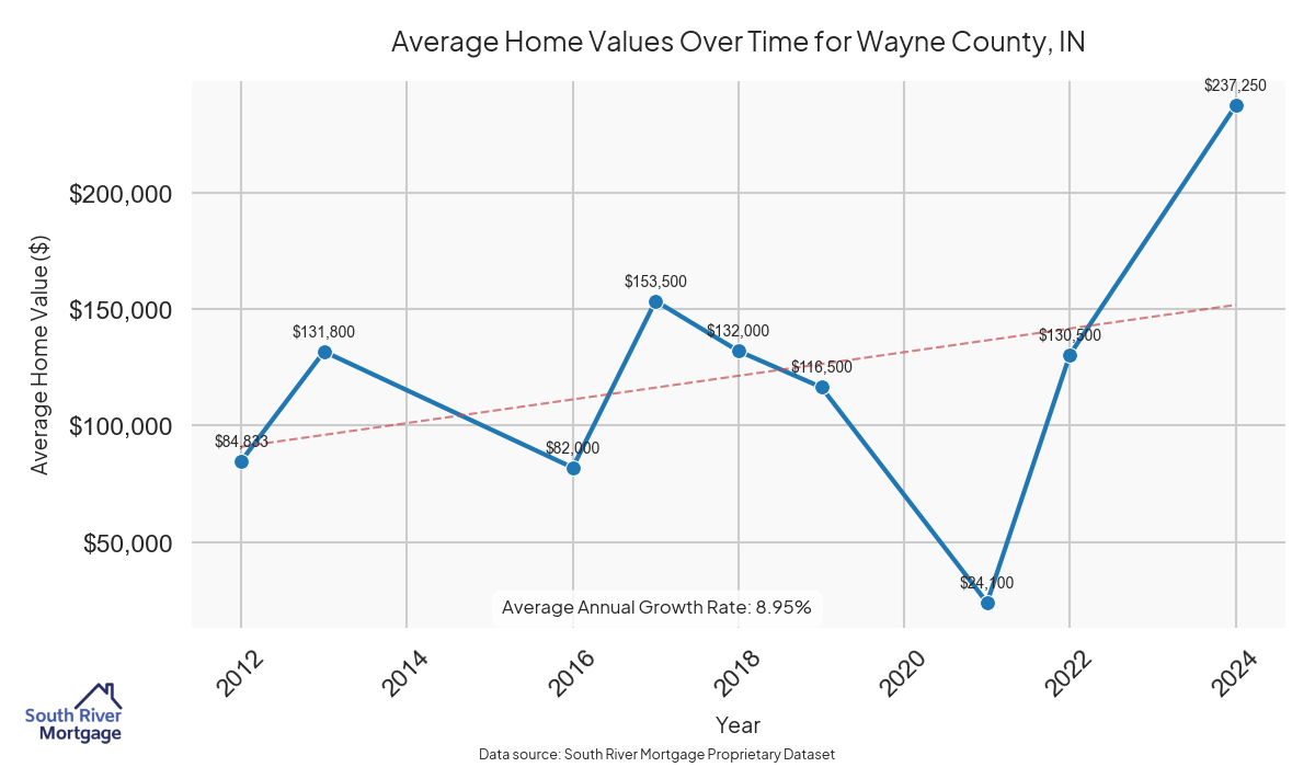 In 2024, there were 28 active reverse mortgage loans in Wayne County, Indiana. The average home value in Wayne County is $149,716.18.