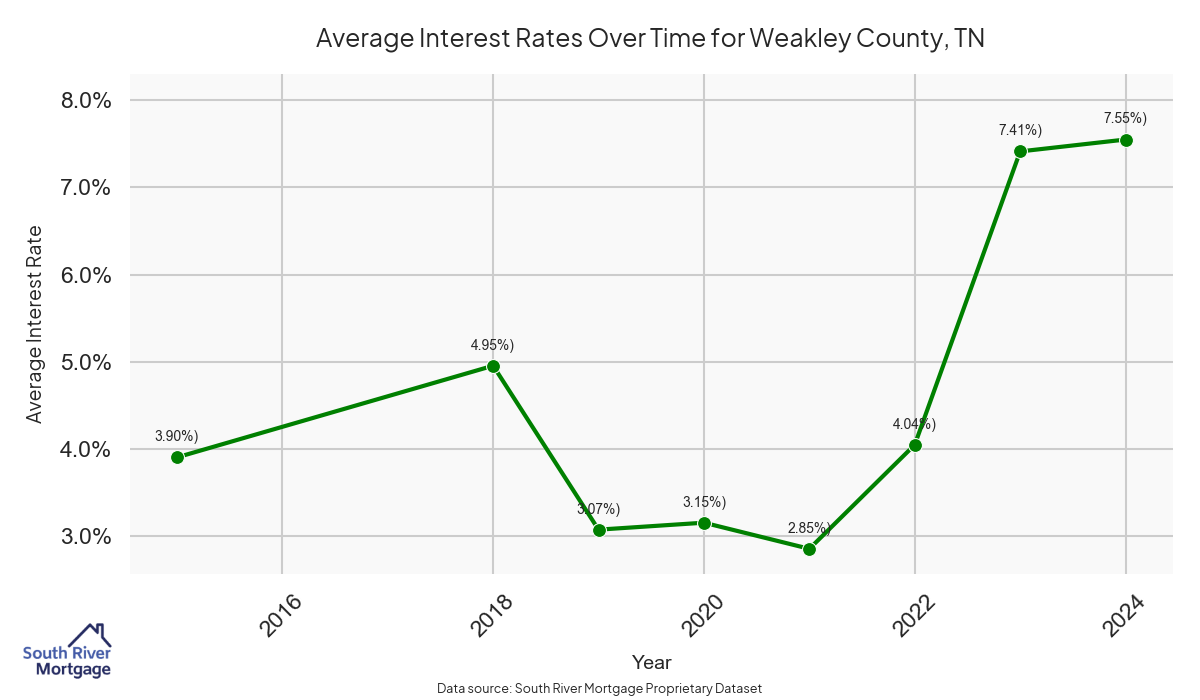 There are approximately 15 active reverse mortgage loans in Weakley County. The average interest rate in Weakley County is 7.41% for reverse mortgages. The average maximum claim amount (the lesser of the appraisal or lending limit), among reverse mortgage borrowers, in Weakley County was $141,666.67 in 2024.