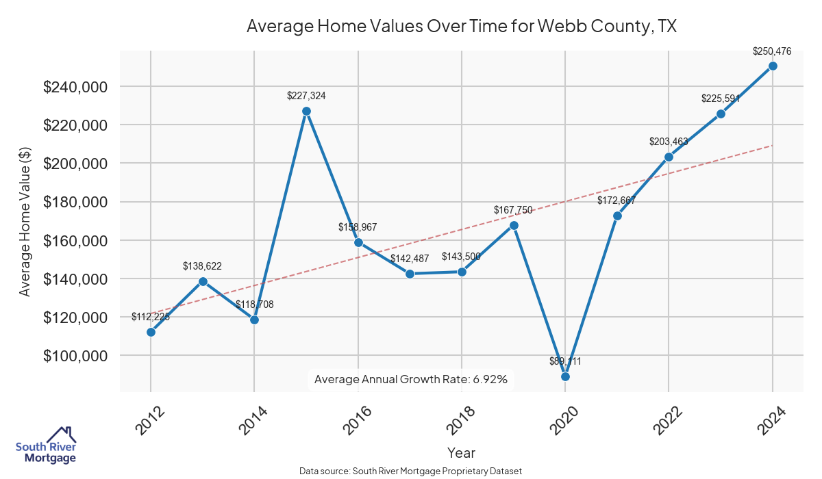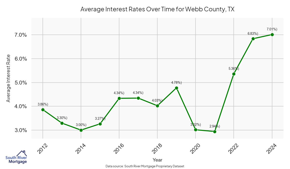 There are approximately 78 active reverse mortgage loans in Webb County. The average interest rate in Webb County is 7.21% for reverse mortgages. The average maximum claim amount (the lesser of the appraisal or lending limit), among reverse mortgage borrowers, in Webb County was $228,333.33 in 2024.