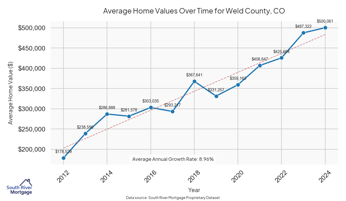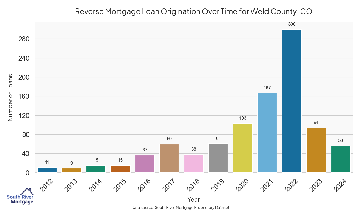 In 2024, there were 936 active reverse mortgage loans in Weld County, Colorado. The average home value in Weld County is $499,739.83.