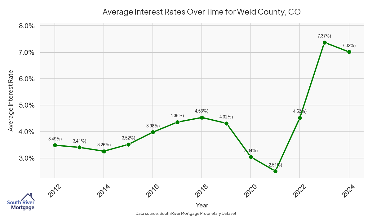There are approximately 936 active reverse mortgage loans in Weld County. The average interest rate in Weld County is 7.42% for reverse mortgages. The average maximum claim amount (the lesser of the appraisal or lending limit), among reverse mortgage borrowers, in Weld County was $505,160.00 in 2024.