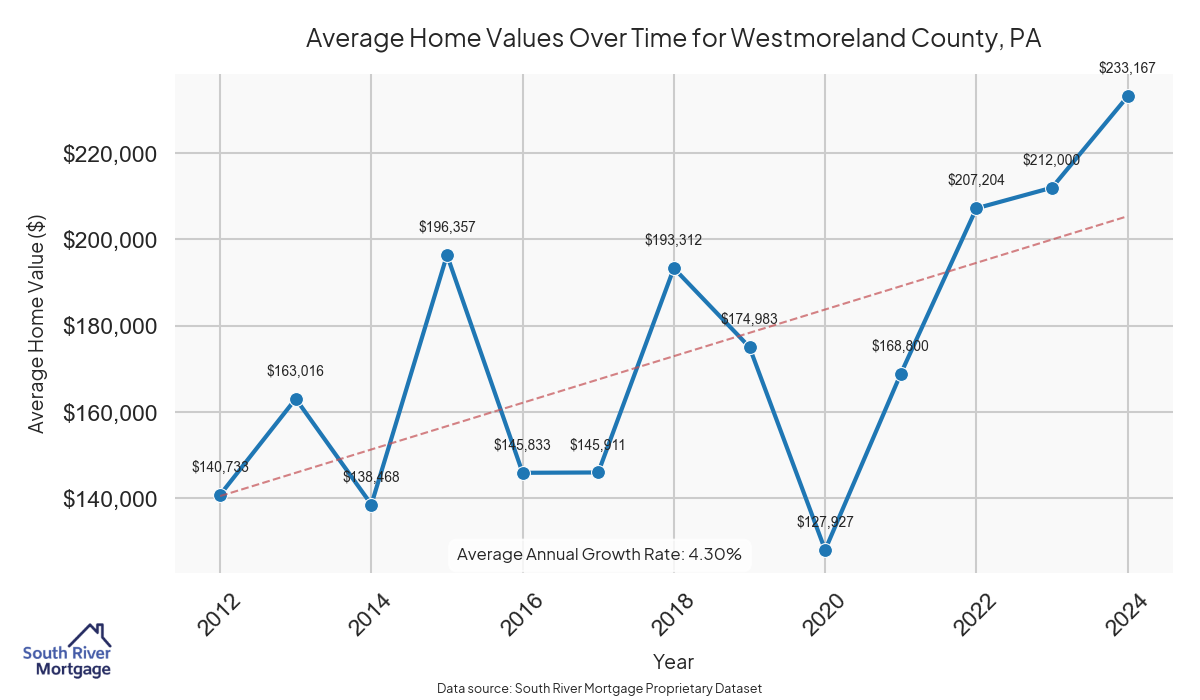 In 2024, there were 254 active reverse mortgage loans in Westmoreland County, Pennsylvania. The average home value in Westmoreland County is $208,941.99.