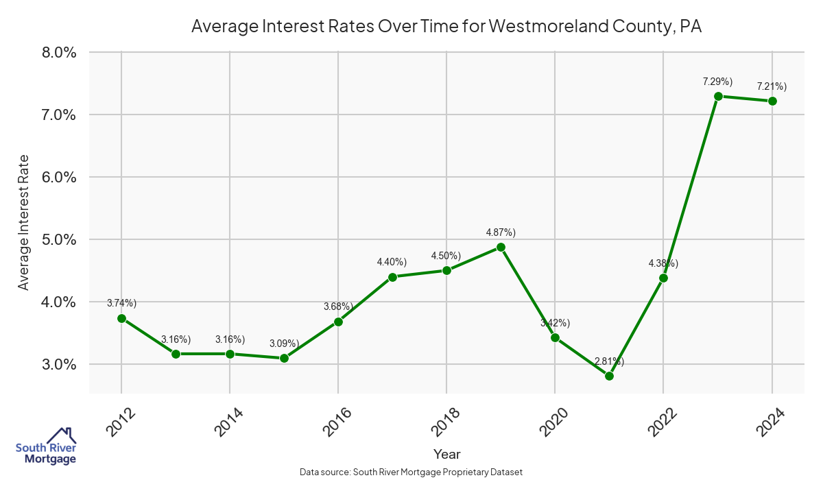 There are approximately 254 active reverse mortgage loans in Westmoreland County. The average interest rate in Westmoreland County is 7.08% for reverse mortgages. The average maximum claim amount (the lesser of the appraisal or lending limit), among reverse mortgage borrowers, in Westmoreland County was $232,647.06 in 2024.