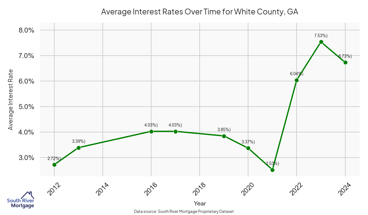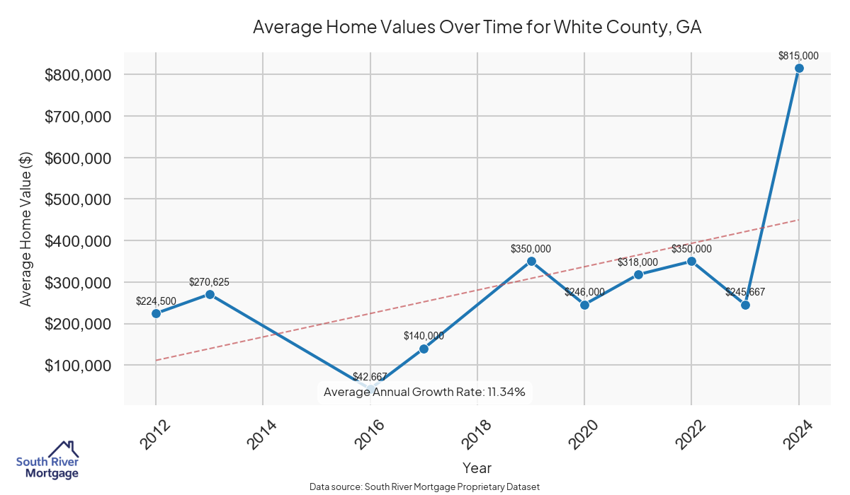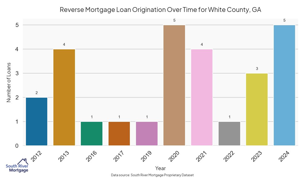 In 2024, there were 27 active reverse mortgage loans in White County, Georgia. The average home value in White County is $542,212.44.