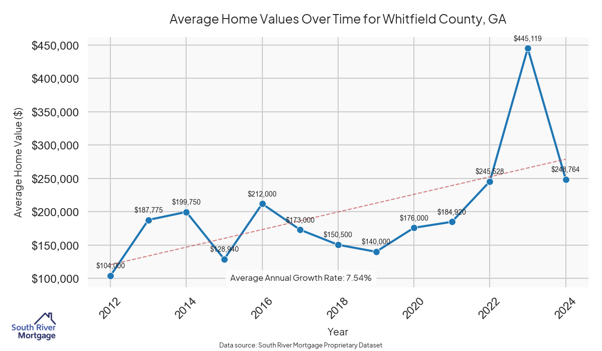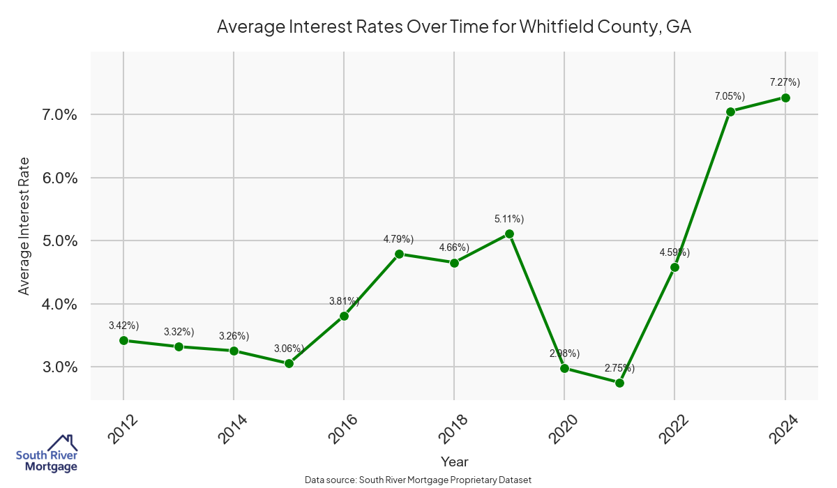 There are approximately 50 active reverse mortgage loans in Whitfield County. The average interest rate in Whitfield County is 7.39% for reverse mortgages. The average maximum claim amount (the lesser of the appraisal or lending limit), among reverse mortgage borrowers, in Whitfield County was $430,000.00 in 2024.
