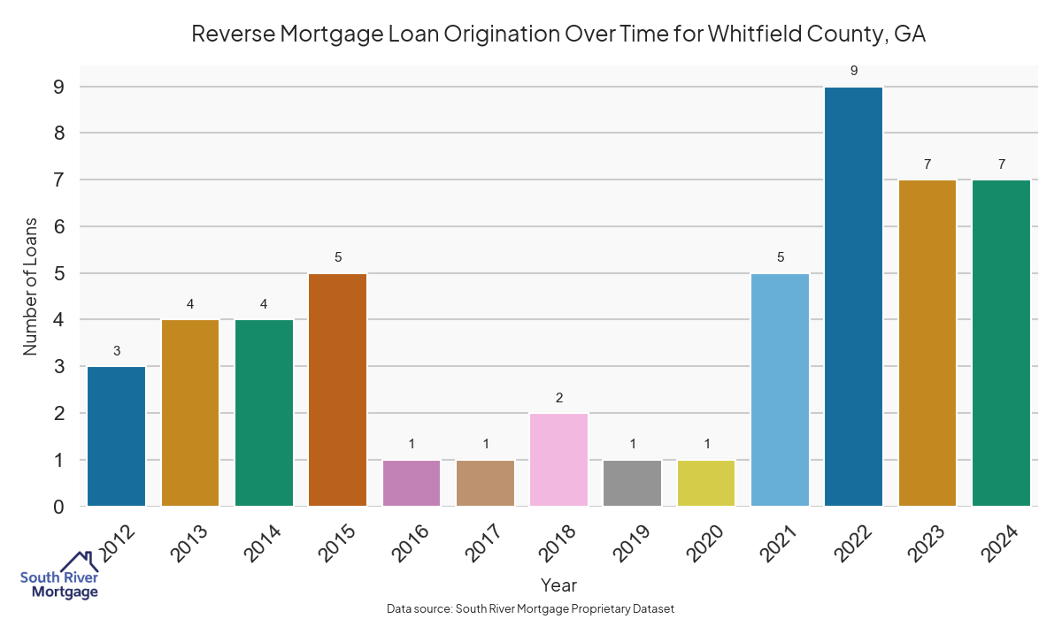 In 2024, there were 50 active reverse mortgage loans in Whitfield County, Georgia. The average home value in Whitfield County is $305,332.22.