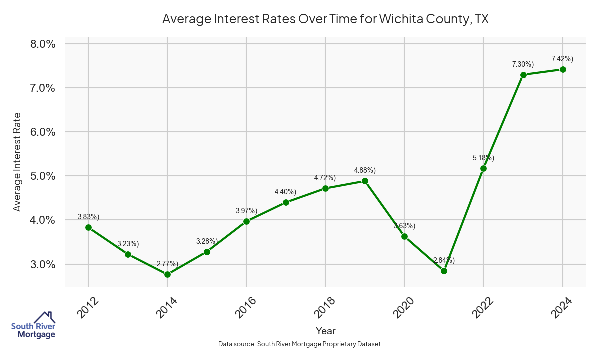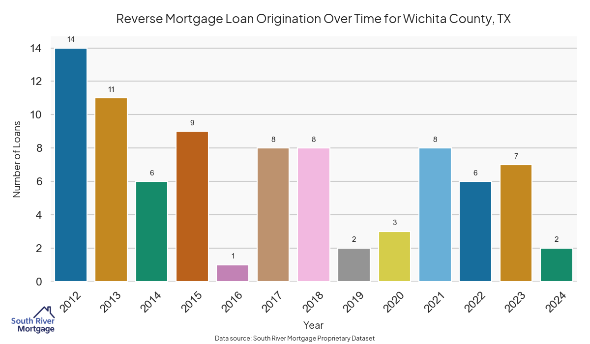 There are approximately 85 active reverse mortgage loans in Wichita County. The average interest rate in Wichita County is 7.84% for reverse mortgages. The average maximum claim amount (the lesser of the appraisal or lending limit), among reverse mortgage borrowers, in Wichita County was $184,285.71 in 2024.