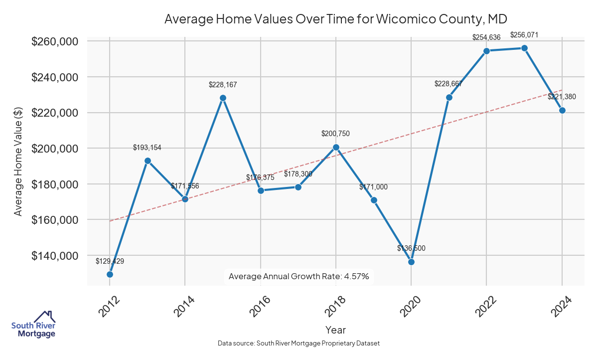 In 2024, there were 94 active reverse mortgage loans in Wicomico County, Maryland. The average home value in Wicomico County is $288,192.88.