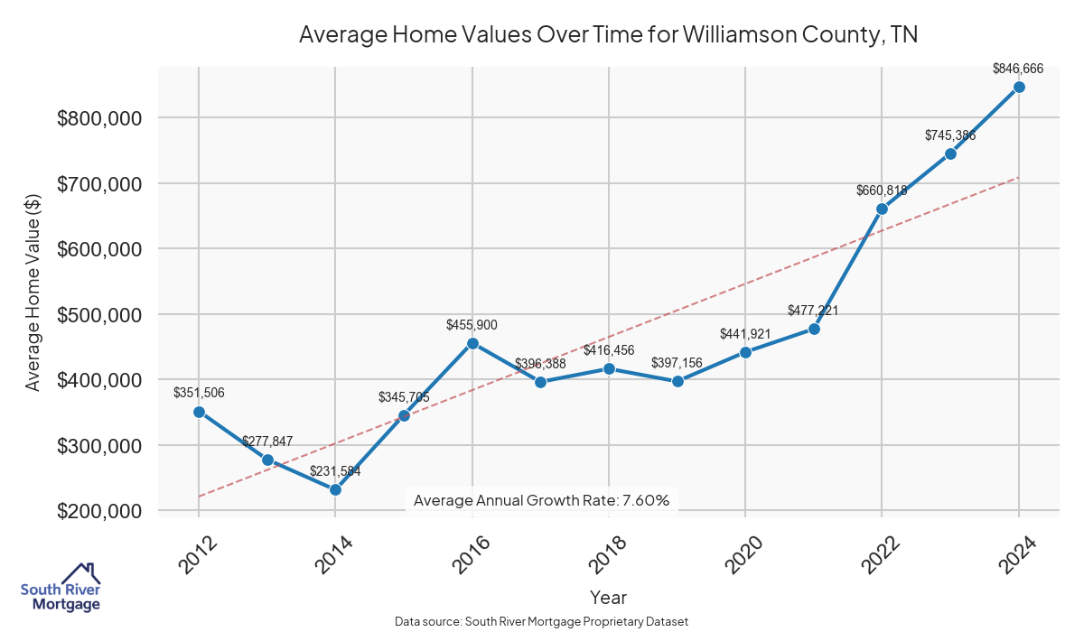 In 2024, there were 218 active reverse mortgage loans in Williamson County, Tennessee. The average home value in Williamson County is $843,717.98.