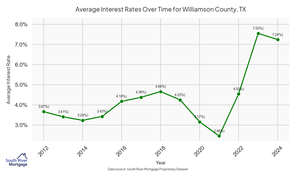 There are approximately 606 active reverse mortgage loans in Williamson County. The average interest rate in Williamson County is 7.53% for reverse mortgages. The average maximum claim amount (the lesser of the appraisal or lending limit), among reverse mortgage borrowers, in Williamson County was $492,669.90 in 2024.