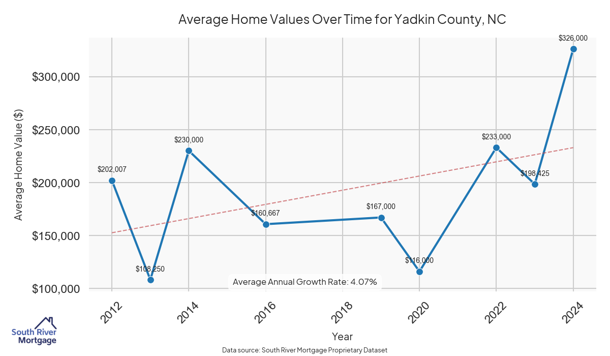 In 2024, there were 21 active reverse mortgage loans in Yadkin County, North Carolina. The average home value in Yadkin County is $294,766.29.