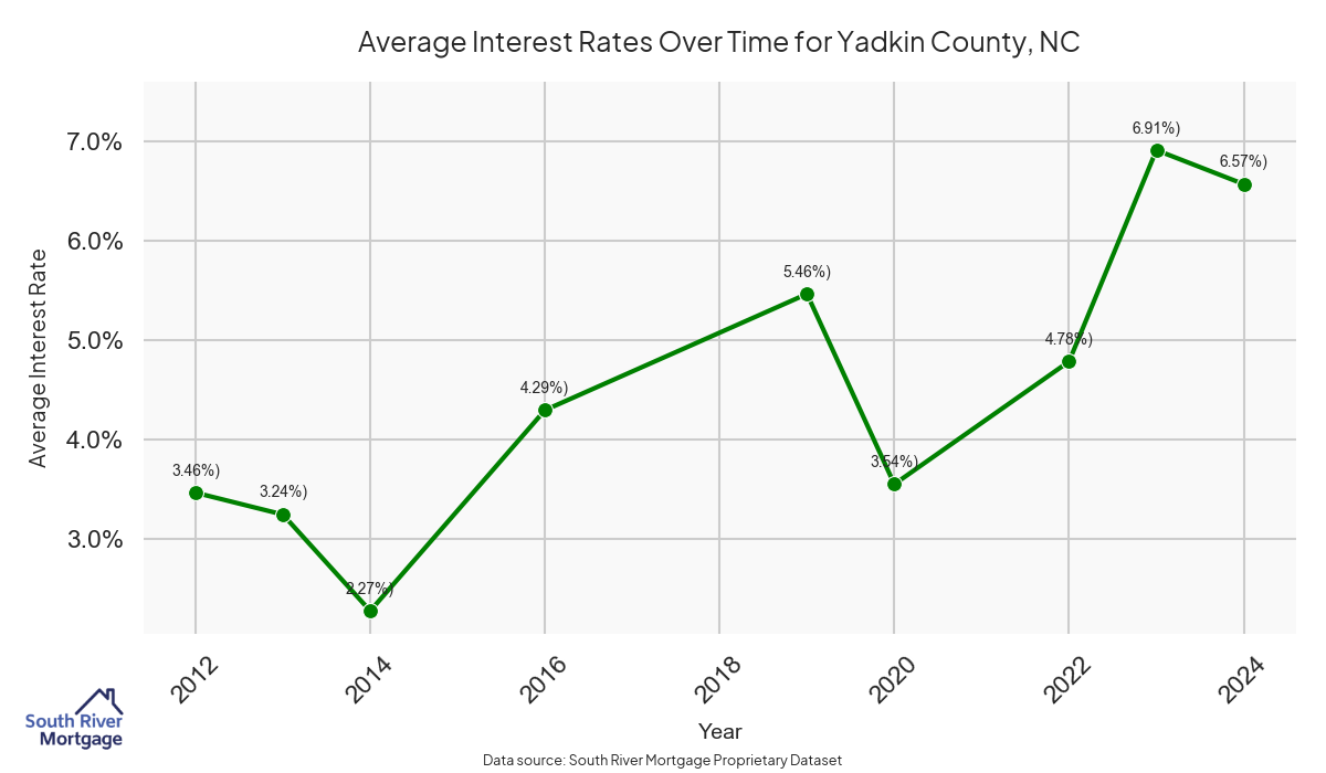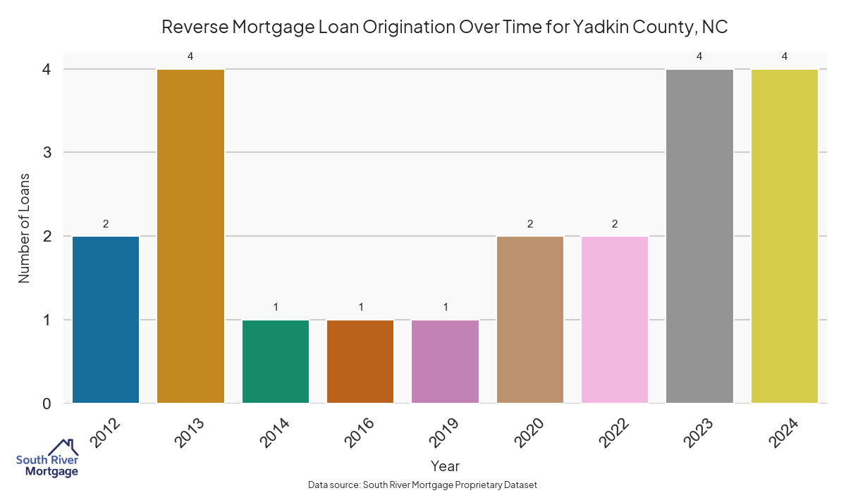 There are approximately 21 active reverse mortgage loans in Yadkin County. The average interest rate in Yadkin County is 7.6% for reverse mortgages. The average maximum claim amount (the lesser of the appraisal or lending limit), among reverse mortgage borrowers, in Yadkin County was $270,000.00 in 2024.